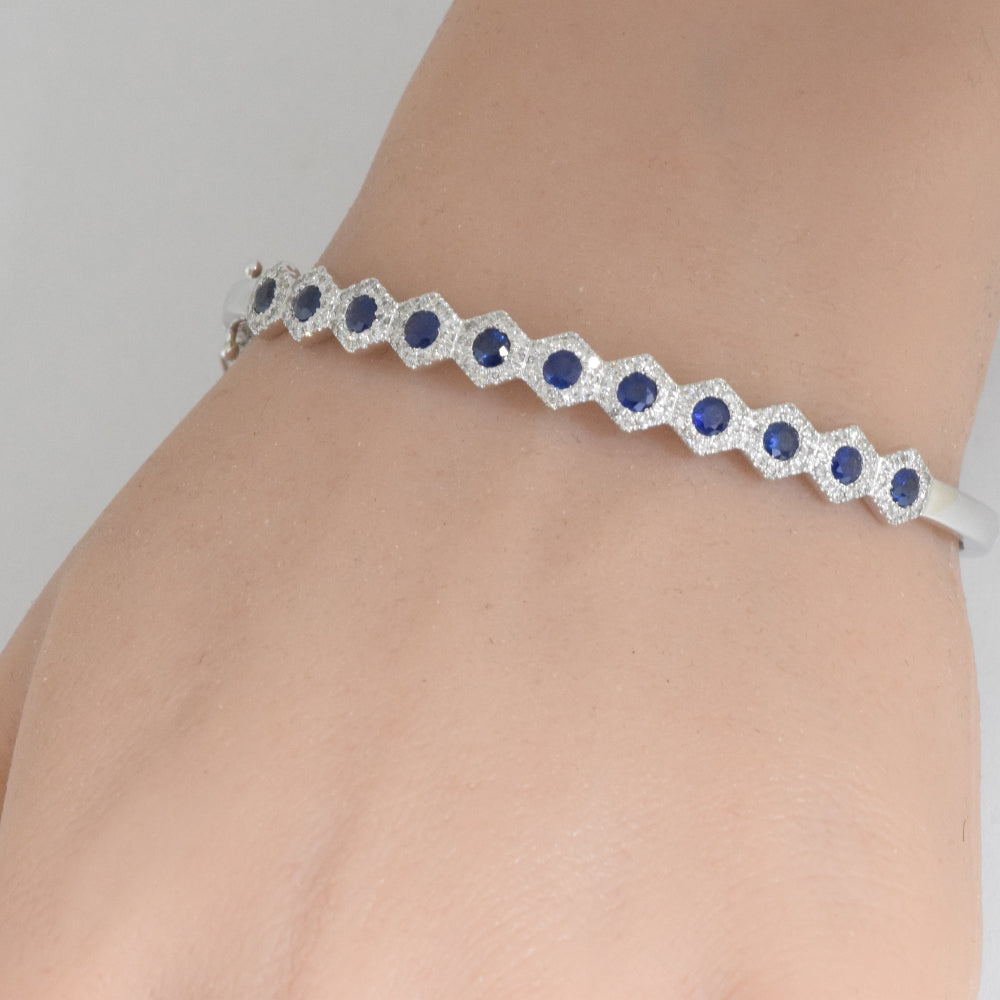 SPECIAL!2.16ct G SI 14K White Gold Octagon Shape Diamond & Blue Sapphire Gemstone Bangle Bracelet