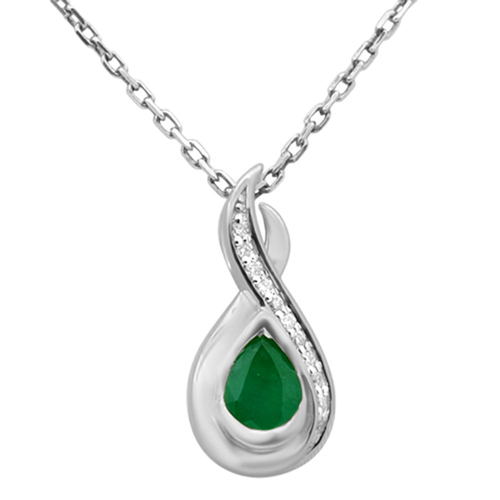 .30ct G SI 14K White Gold Diamond & Emerald Gemstone Teardrop Pendant 18" Long