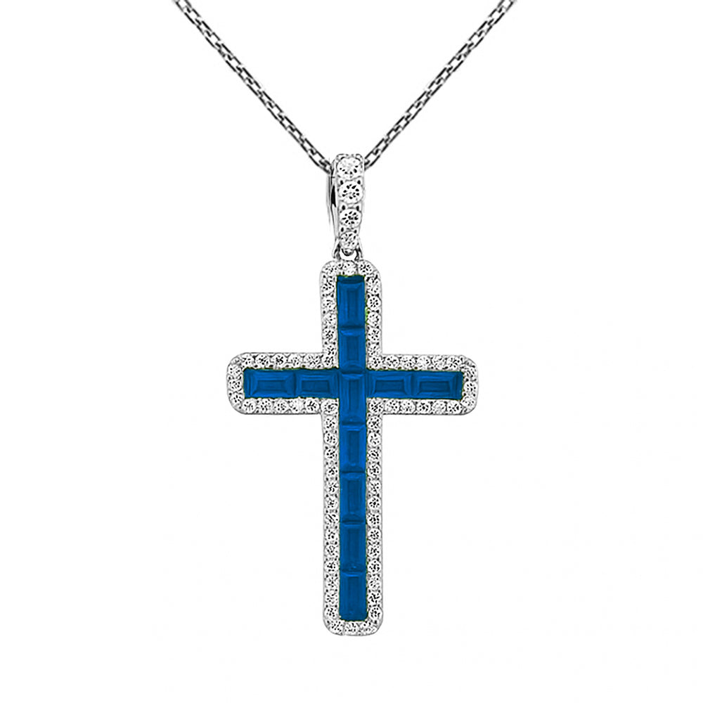SPECIAL!1.72ct G SI 14K White Gold Diamond & Blue Sapphire Gemstone Cross Pendant 18" Long