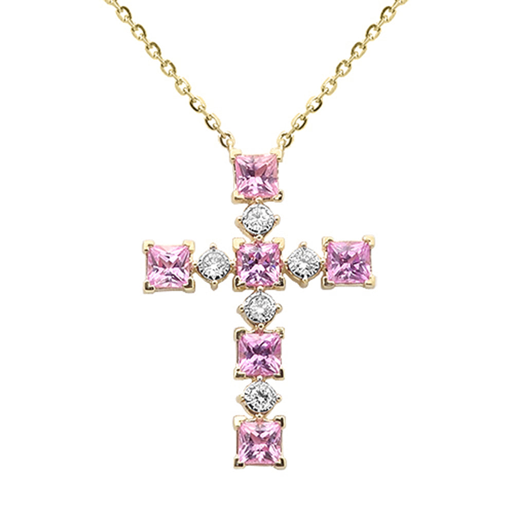 SPECIAL!.86ct G SI 14K Yellow Gold Diamond & Pink Sapphire Gemstone Cross Pendant 18" Long