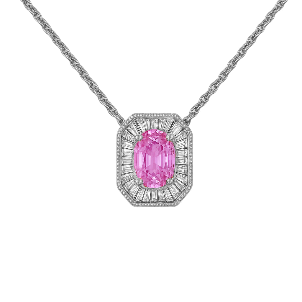 SPECIAL! .46ct G SI 14KT White Gold Baguette Diamond & Oval Shape Pink Sapphire Gemstone Pendant Necklace 16+2"