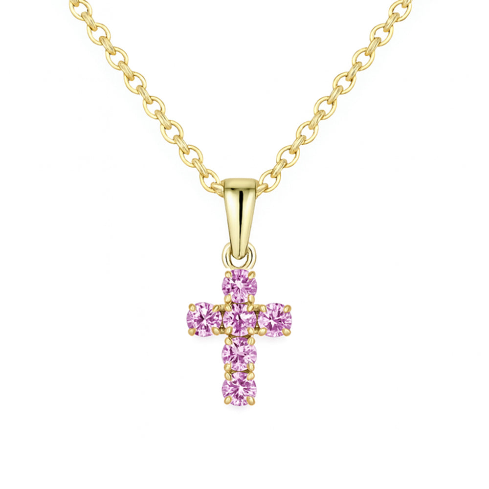 SPECIAL! .54ct G SI 14KT Yellow Gold Pink Sapphire Round Shape Gemstone Petite Cross Pendant Necklace 18" Chain
