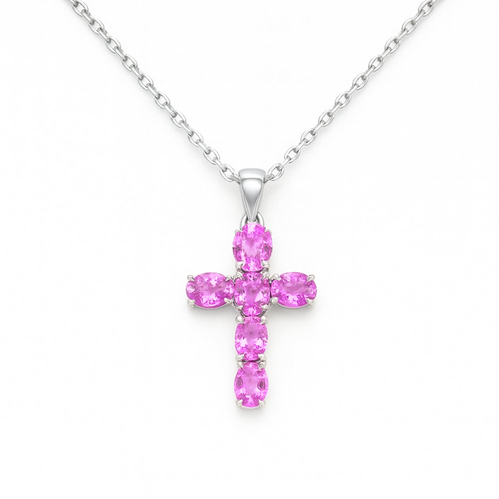 SPECIAL! 1.17ct G SI 14KT White Gold Oval Shape Pink Sapphire Gemstone Cross Pendant 18" Chain