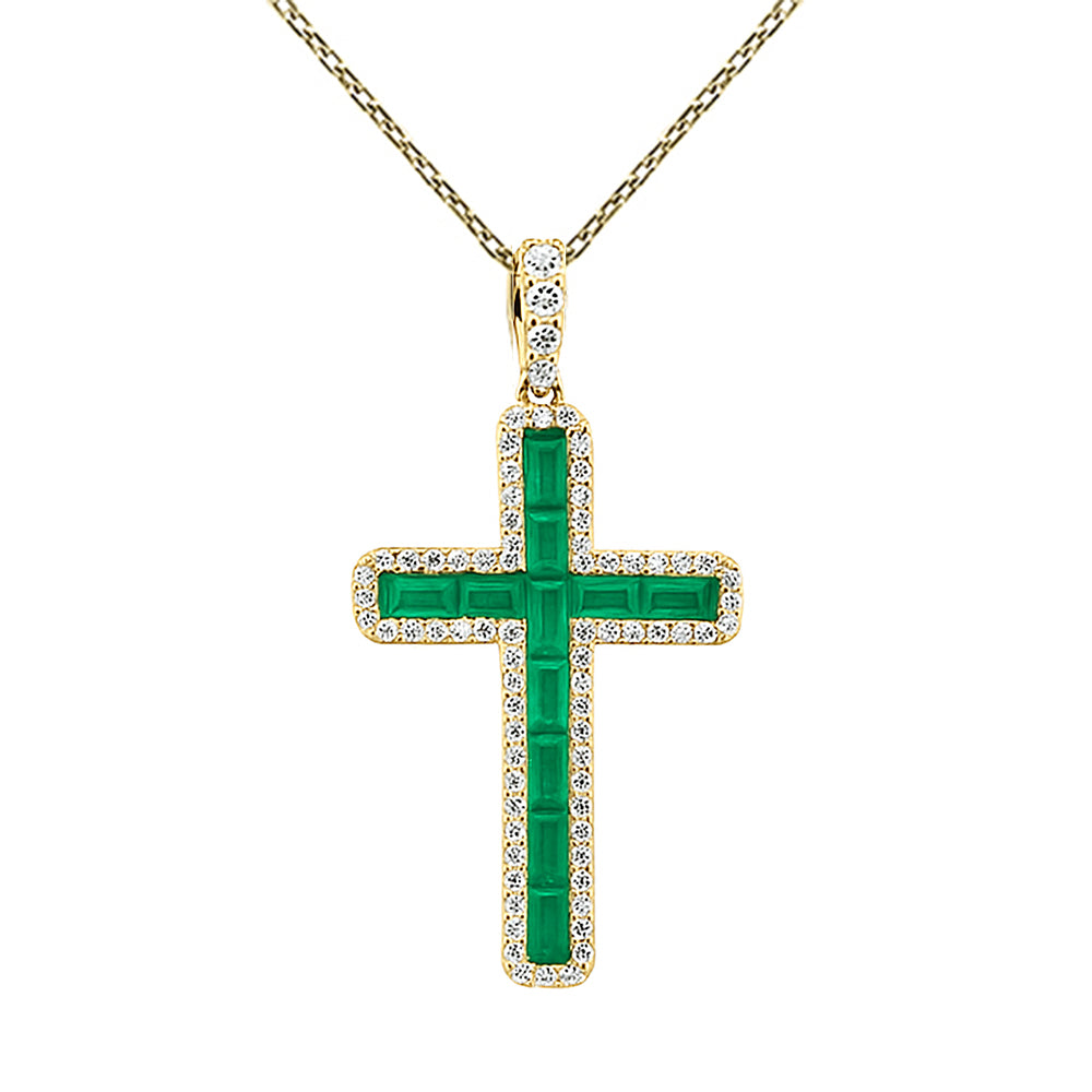SPECIAL!1.09ct G SI 14K Yellow Gold Diamond & Emerald Gemstone Cross Pendant 18" Long