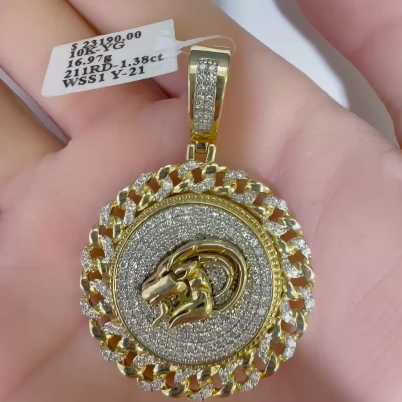 DIAMOND CLOSEOUT! 1.35CT G SI 10KT Yellow Gold Diamond Iced Out Micro Pave Ram Head Charm Pendant