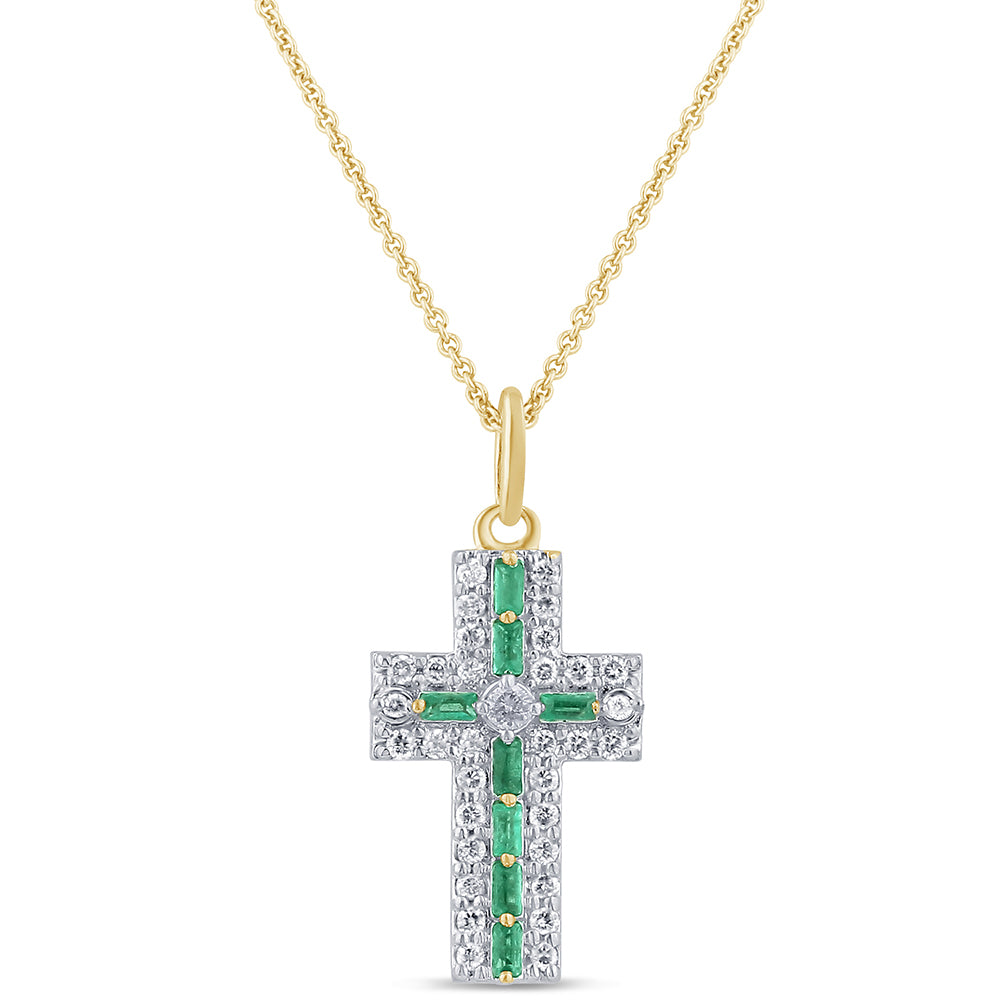 SPECIAL! .35ct G SI 14K Yellow Gold Diamond & Emerald Gemstone Cross Pendant Necklace 16" + 2" Ext