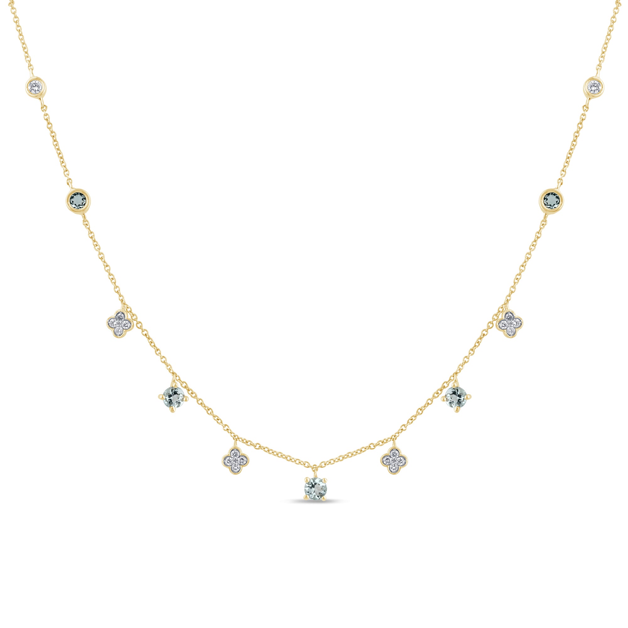 - Stone Count: 18 Round Diamonds & 5 Aquamarines