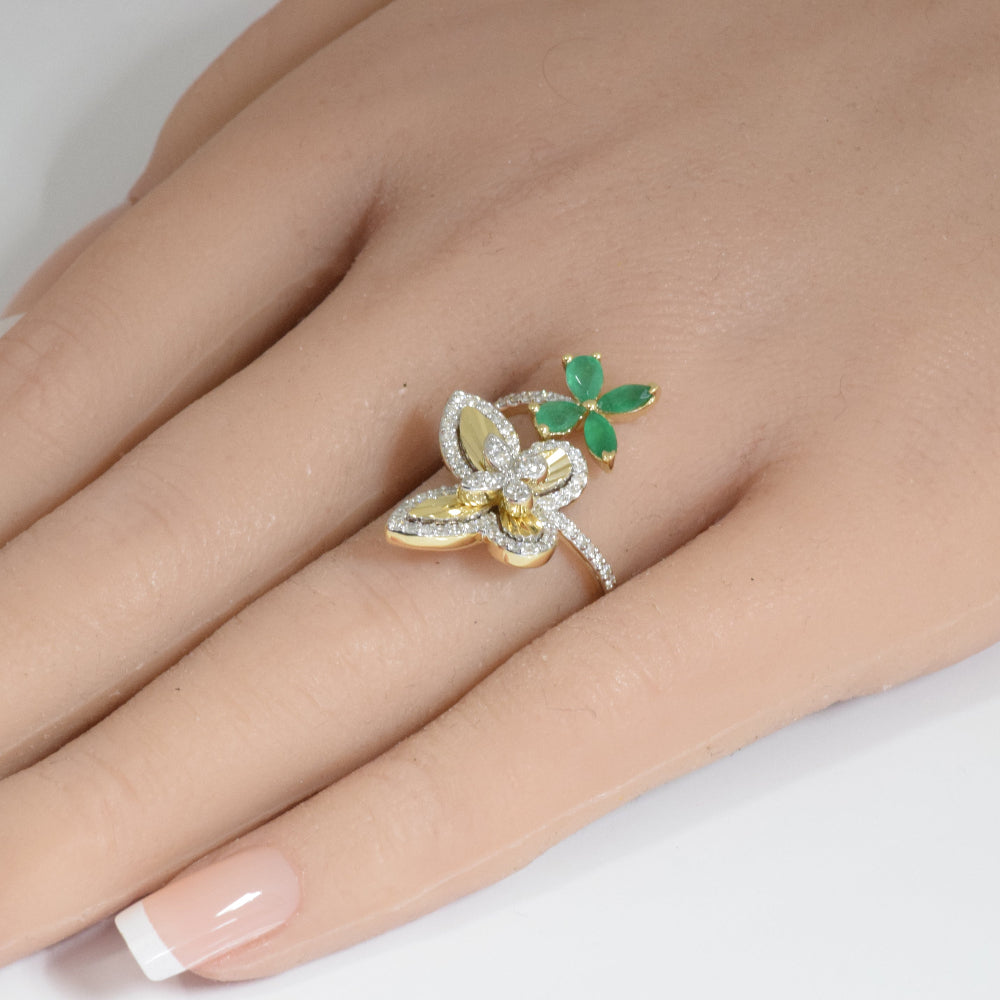 SPECIAL! .91ct G SI 14K Yellow Gold Diamond & Emerald Gemstone Butterfly Ring Size 6.5